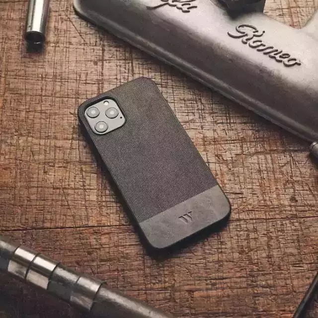Funda confeccionada con auténtico tejido grogrén (del francés gros grain) y acabado en cuero ecológico jaspeado.